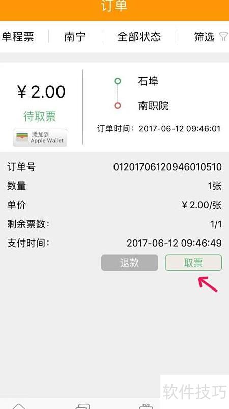 7、 稍后取票请点左上角返回,系统将自动跳转至订单页面,可查看已购地铁单程票的详细信息,并进行后续取票操作。