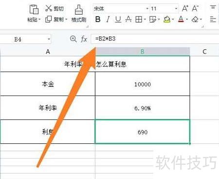 3、 在利息栏输入公式=B2*B3,计算得出结果为690元。