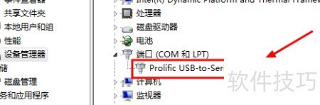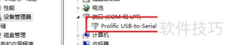 4、 在设备管理器中打开端口选项,若显示USB-to-Serial端口及对应COM号,则表明设备连接正常。