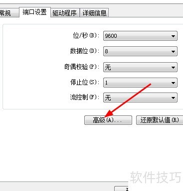 6、 进入USB转串口属性,切换至端口设置,选择高级选项。