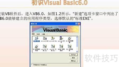 19、 VB6.0提供了四种工具栏,分别是编辑、标准、窗体编辑器和测试,方便用户快速执行常用操作。通过选择视图菜单中的工具栏命令,可控制工具栏的显示或隐藏。图1.4展示了标准工具栏中各个按钮的功能说明,便于用户识别和使用相关工具。