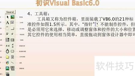21、 工具箱也称控件箱,包含1.5所示的21种VB6.0标准控件。指针用于选择、移动或调整窗体及控件的位置和大小,本身不能创建控件。其余控件操作简便,只需将其拖拽至窗体设计器中即可使用,方便快捷,适用于各类界面设计需求。