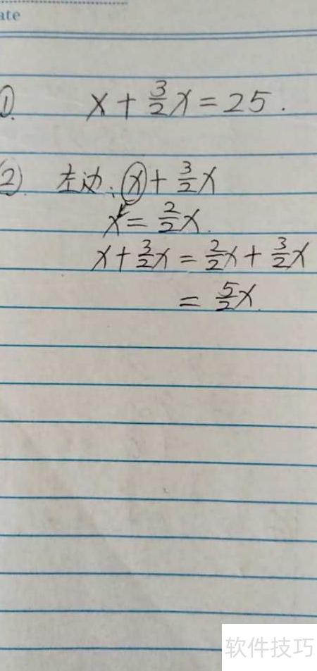 1、 解题时先观察方程形式,如x+3/2x=25,这是一元一次方程。左边包含整数与分数相加,需统一化为分数形式,以便进行合并运算,进而求解未知数。