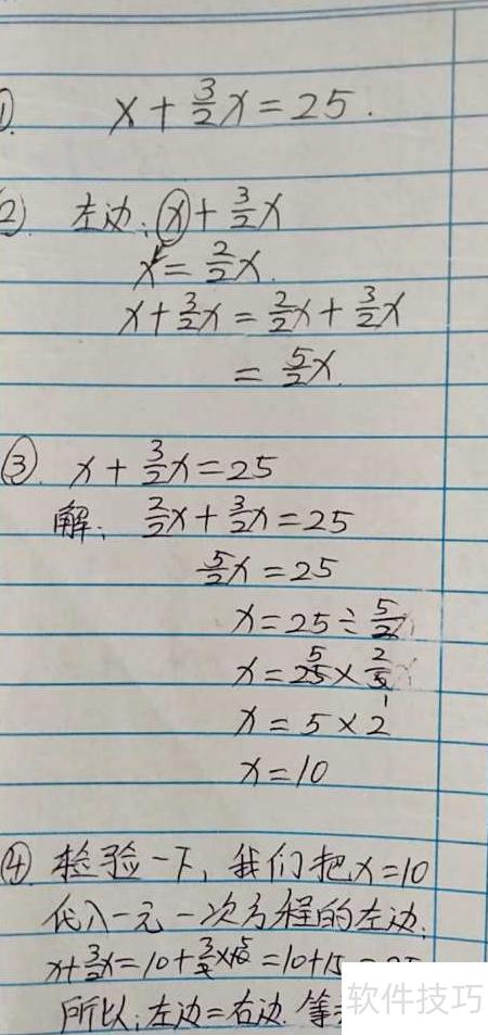 4、 将x=10代入方程左边,得10+3/2×10=10+15=25,与右边相等,说明等式成立,解法正确。大家理解了吗?