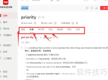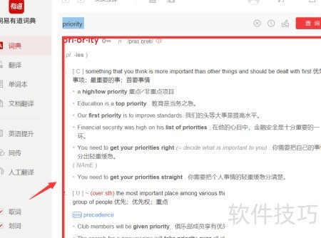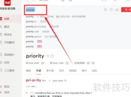 1、 打开笔记本,启动网易有道词典,于搜索栏内键入priority进行查询。