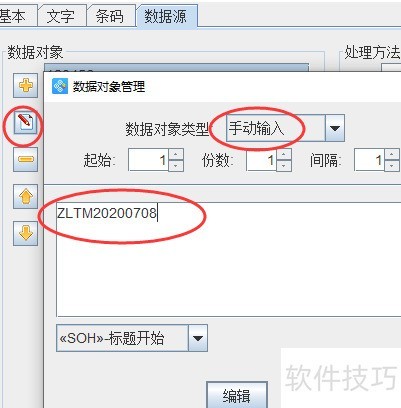 5、 在条码的图形属性数据源中点击修改,选择手动输入类型,输入内容为ZLTM20200708。