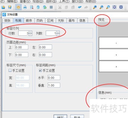 1、 新建文档后,在设置中选择打印机,纸张尺寸设为50mm×50mm,布局为3行1列。勾选手工设置标签间距,将垂直距离调整为1mm,右侧预览窗口可实时查看标签排版效果,确认无误后保存设置即可开始编辑内容。