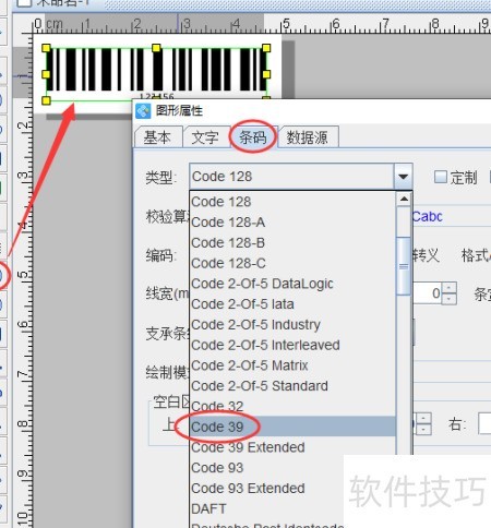 3、 点击软件左侧绘制一维条码按钮,在画布上创建条形码,双击该对象进入图形属性中的条码设置,根据需要选择条码类型,此处以Code39为例进行自定义配置。