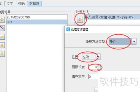 6、 在数据对象下方点击+,选择序列生成类型,起始值设为1;再配置处理方式,选择左端补足,设定目标长度为3位。