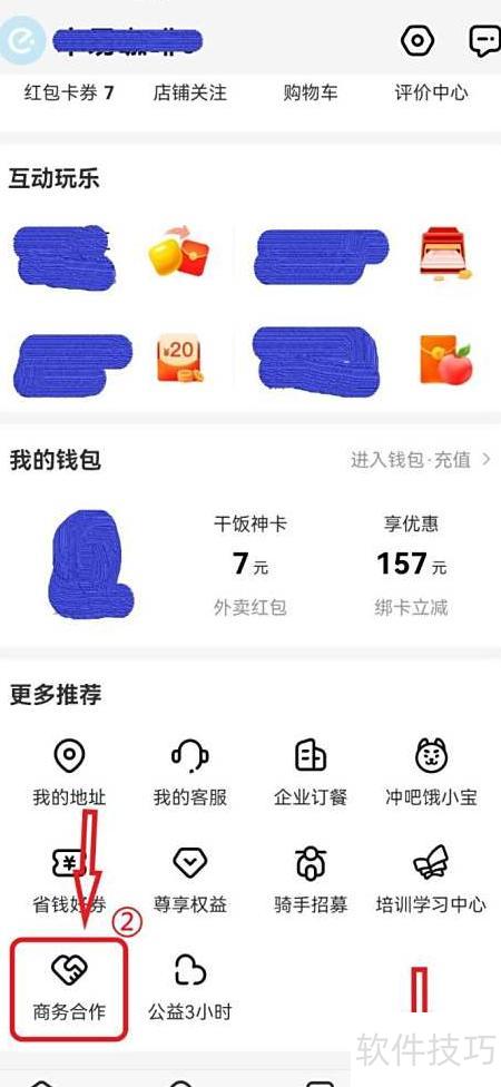 1、 打开饿了么App,进入我的页面,找到更多推荐中的商务合作并点击。