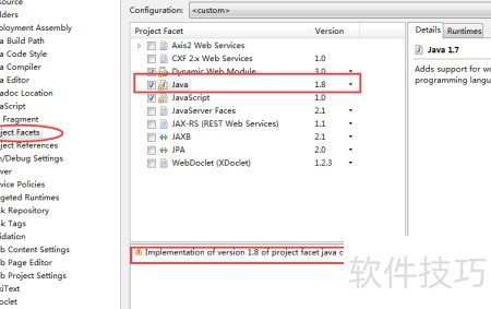 1、 在项目属性中查看Facets,发现默认版本为1.8,而我的项目配置为1.7。