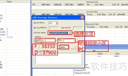 2、 选择锁定EARFCN和PCI,宏站EARFCN设为1825,室分设为100,输入目标小区PCI后点击应用即可完成设置。