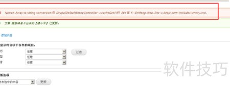 14、 编辑保存时出现报错提示:Notice: Array to string conversion in DrupalDefaultEntityController->cacheGet()(位于includes/entity.inc文件第364行)。该问题源于数组被当作字符串处理,导致类型转换异常。解决方法是打开includes/entity.inc文件,定位到第364行,将原本直接拼接数组的代码修改为先判断变量类型,或使用合适的数组处理方式,例如通过serialize或implode等函数进行安全转换,避免PHP警告。修改后保存并清除缓存,问题即可消除,确保系统正常运行。
