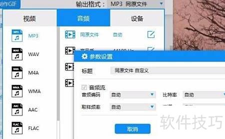 10、 点击右上角输出格式旁的下拉箭头,在音频选项中选择MP3,如需调整其他设置,可进入自定义进行参数配置。