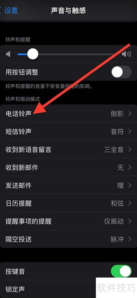 4、 下滑进入声音与触感页面,点击电话铃声选项。