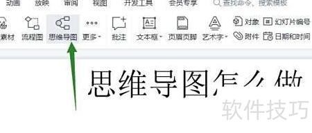 在PPT中选择目标页面,通过菜单添加思维导图即可完成操作。