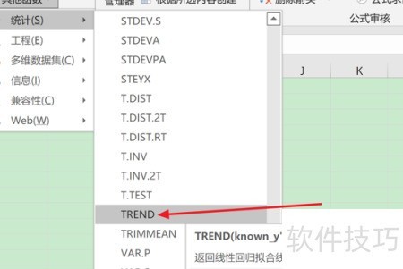 6、 在弹出的子菜单里,点击选择TREND函数。