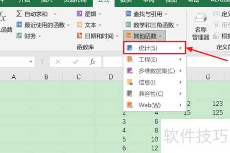 5、 在弹出的下拉菜单中选择统计功能。