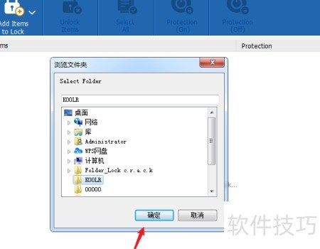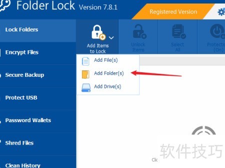 3、 点击工具栏中的添加项目到锁定,在弹出的二级菜单中,因需操作文件夹,故选择添加文件夹选项即可。