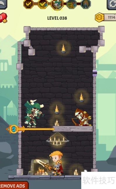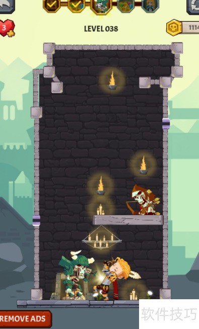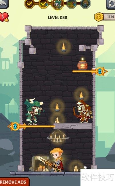 1、 金发少年需清除所有骷髅兵,地面有两个别针,具体布局见图示。