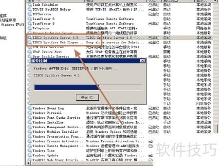 3、 打开Windows服务管理器,定位以T开头的服务项。其中TIBCO Spotfire Web Player包含两个相邻的服务,所示框选部分。请依次对这两个服务执行重启操作,确保其正常运行。