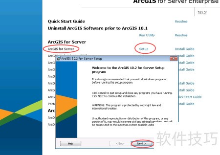 1、 运行ArcGIS Server安装包,点击ArcGIS for Server后的Setup,打开安装界面后点击下一步,具体操作所示。