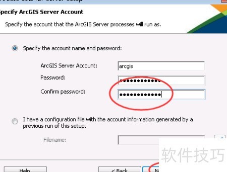 5、 为名为arcgis的ArcGIS Server账户设置密码,密码须包含大写字母、小写字母、数字及特殊字符,确保牢记所设密码,后续步骤将需要用到。完成设置后,点击下一步按钮,操作界面所示。
