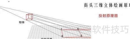 4、 这是正方体在地面上的投影效果示意图。由于视角影响,正方体在视觉上呈现为上宽下窄的长方体形态。若视点较低,这种透视变形会更加显著,形体被拉得更长,甚至趋于柱状。当视线低于物体时,其投影可能无限延伸。因此,绘制三维立体画时常采用较高视点,以控制画面长度,避免受场地空间限制。