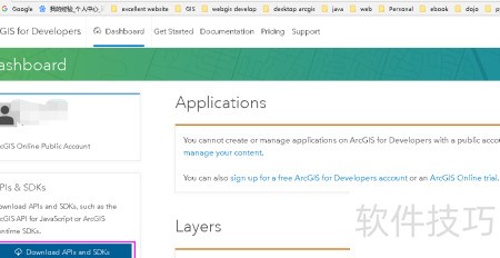 1、 前往ArcGIS for开发者官网,登录个人账户后,进入下载页面。在页面中找到下载API和SDK选项,点击图示按钮即可获取JavaScript API安装包,按照指引完成下载与配置,便于后续开发使用。