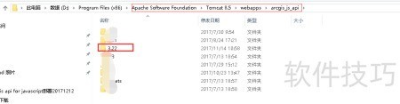 4、 下载后解压文件,将其放入Tomcat的webapps目录下;在该目录中新建名为arcgis_js_api的文件夹,并在其内再创建一个名为3.22的子文件夹。