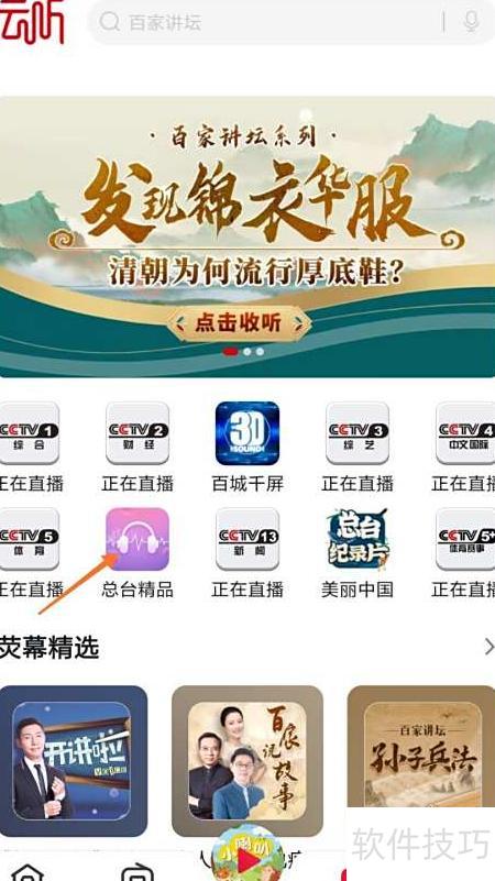 2、 进入听电视页面后,点击顶部的总台精品选项。