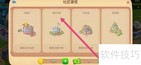3、 进入社区建筑页面,查找并查看保龄球馆相关信息。