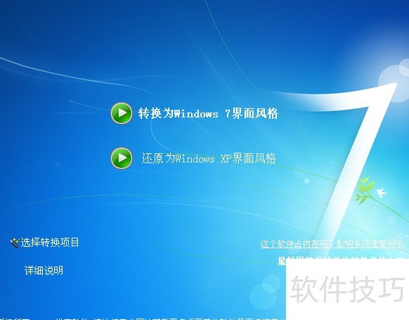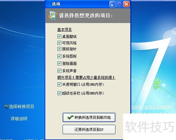 5、 在系统托盘区域右键点击该软件,从弹出的菜单中可勾选AeroShake或AeroSnap功能,实现类似Windows 7的Aero视觉效果。若希望恢复经典的XP界面风格,只需运行软件后选择还原为Windows XP界面风格选项,系统界面便会切换回XP样式。在主界面左下角点击选择转换项目,将打开一个设置对话框,用户可根据个人喜好选择需要更改为Win7风格的界面元素,如登录界面、桌面背景等。勾选所需项目后,点击转换所选项目到新风格,稍等片刻,系统界面即可呈现Win7的外观效果。若想将已更改的部分重新恢复为XP风格,只需点击还原所选项目到XP按钮,即可完成回退操作,整个过程简单直观,便于用户自由切换不同界面风格。