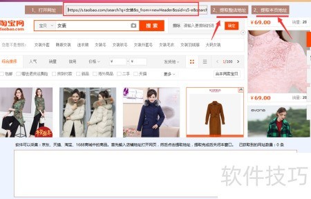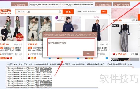 14、 若需采集淘宝中女装类商品,可复制该类目链接并粘贴至软件的网页输入框。如需获取全部页面的商品信息,应选择提取整店地址;若仅需当前页面的商品数据,则选择提取本页地址即可完成操作。