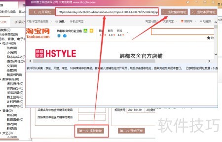 12、 在大商创助手中,点击第一步,提取地址,打开网页后,将目标网店链接粘贴至输入框,选择提取整店地址,即可自动采集该店铺全部商品信息。