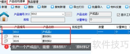 8、 产成品1由一份原材料1与一份原材料2共同构成。