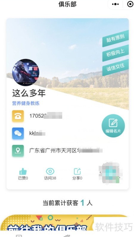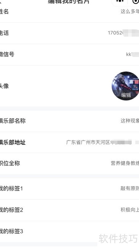 2、 根据名片提示,依次填写姓名、电话、微信号,上传头像,填写俱乐部名称、地址、职位全称及三个个人标签,具体样式所示。