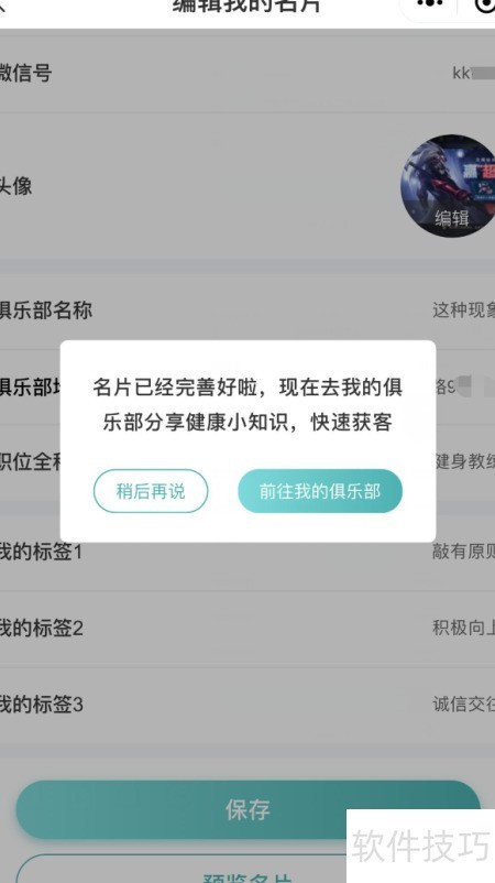 4、 预览无误后点击保存,出现提示框即表示名片编辑成功,具体所示。