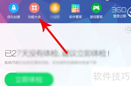 2、 启动电脑后,进入360安全卫士主页,选择功能大全即可。