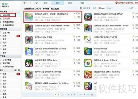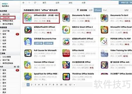 3、 在未越狱设备上下载正版应用,可打开PP助手Windows版,进入正版应用界面搜索Office相关软件,按图示操作,任意选择一款Office应用进行下载即可完成安装。
