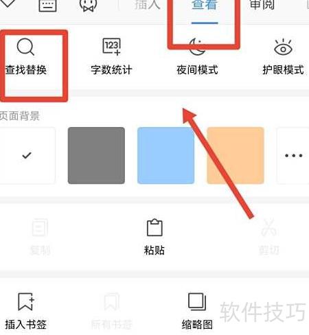 4、 向右滑动弹出菜单,选择查看,点击查找替换功能。