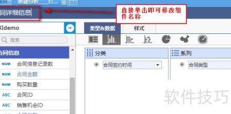 9、 在FineBI组件属性面板顶部点击组件名称,可将其重命名为合同详细信息,具体操作所示。