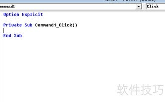 2、 在窗体中添加一个名为command1的命令按钮,随后在程序代码窗口的对象下拉列表中选择form,此时代码列表框中将显示相应的代码内容。