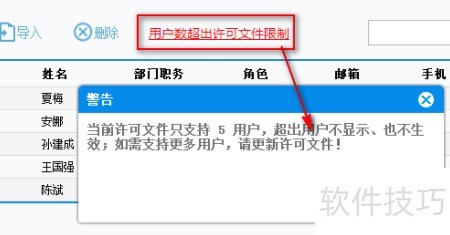 8、 当系统中添加的用户数量超过注册文件规定的上限时,即为超出许可限制,此时点击将弹出警告提示框,具体所示。