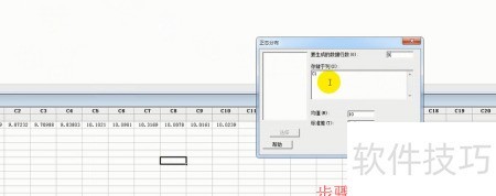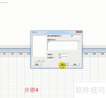 11、 依次修改C1至C10列的数据:首先,在储存于列(S)下方的输入框中选择C1,将均值(M)后面的数值更改为该列对应工作表中的实际数据,例如将10改为10.2,接着将标准差(T)后的0.2修改为0.02,完成后点击确定按钮。随后,再次进入设置,将储存于列(S)中的C1更改为C2,并将均值(M)处的数值更新为C2列对应的实际值,如9.87,同时保持标准差(T)为0.02,确认无误后点击确定。按照此操作流程,逐一对C3至C10各列进行相同设置,确保每一列的均值和标准差均根据对应工作表中的实际数据准确填写,最终完成全部列的数据修改。整个过程需逐一核对数值,确保输入正确无误。