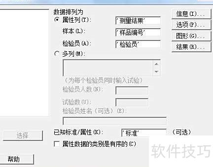 6、 在属性一致性分析时,需依次选择测量结果、样品编号、检验员和标准,确认无误后完成操作。