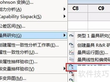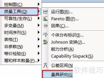 6、 接着依次点击统计、质量工具、量具研究,选择创建量具R&R交叉表。