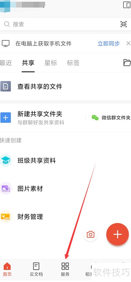 1、 启动WPS应用,进入首页后选择服务选项。