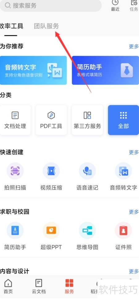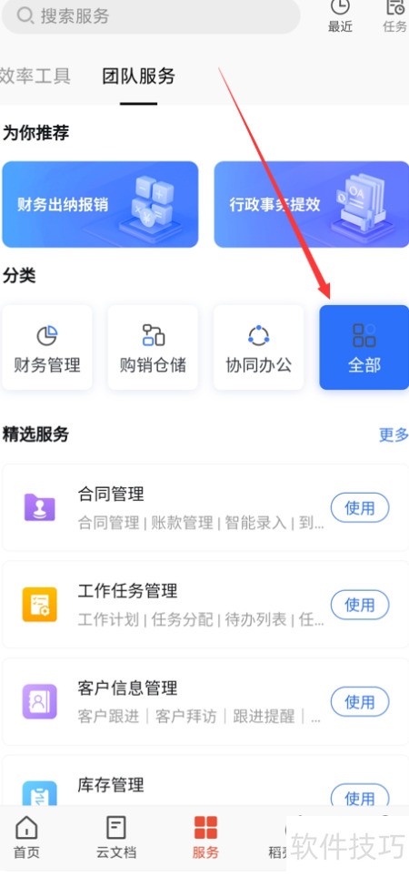 3、 进入团队服务,选择全部类别。