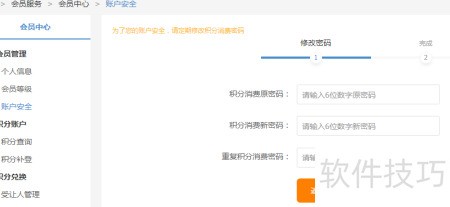 6、 进入修改密码页面,依次输入原积分消费密码和新密码,确认后完成修改。首次设置时原密码可任意填写,后续修改则需正确输入当前密码方可变更。
